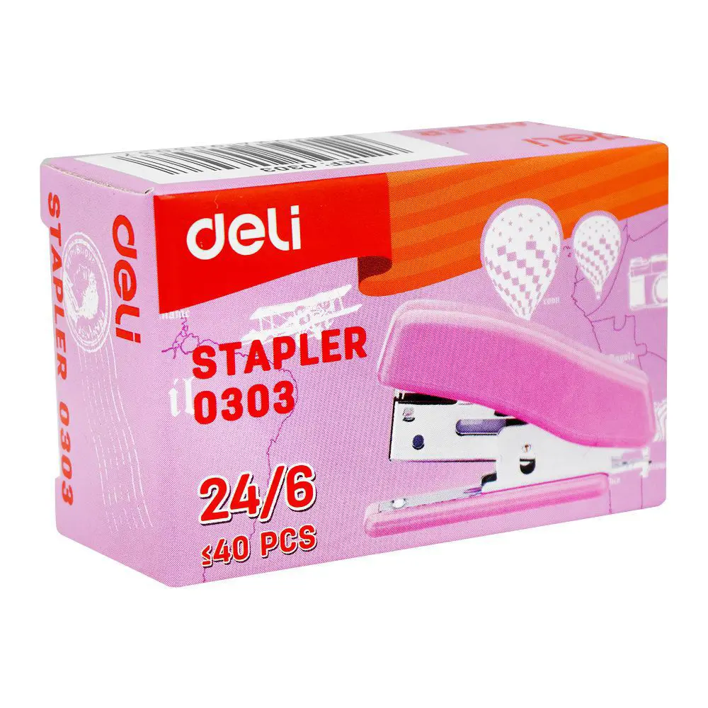 Deli E0303 Mini Stapler for 24/6 & 26/6 pins. Staple up to 12 sheets of 80 gsm. Integrated stapler pin remover. Low staple indicator. Maximum staple filling capacity of 40 pins. Ideal for school and home use. Use a stapler with No.24/6 & 26/6 # size staples/pins. Ergonomic design for a comfortable grip. Constructed of ABS and Steel material. Available in three assorted colours: Blue, yellow, magenta asst.