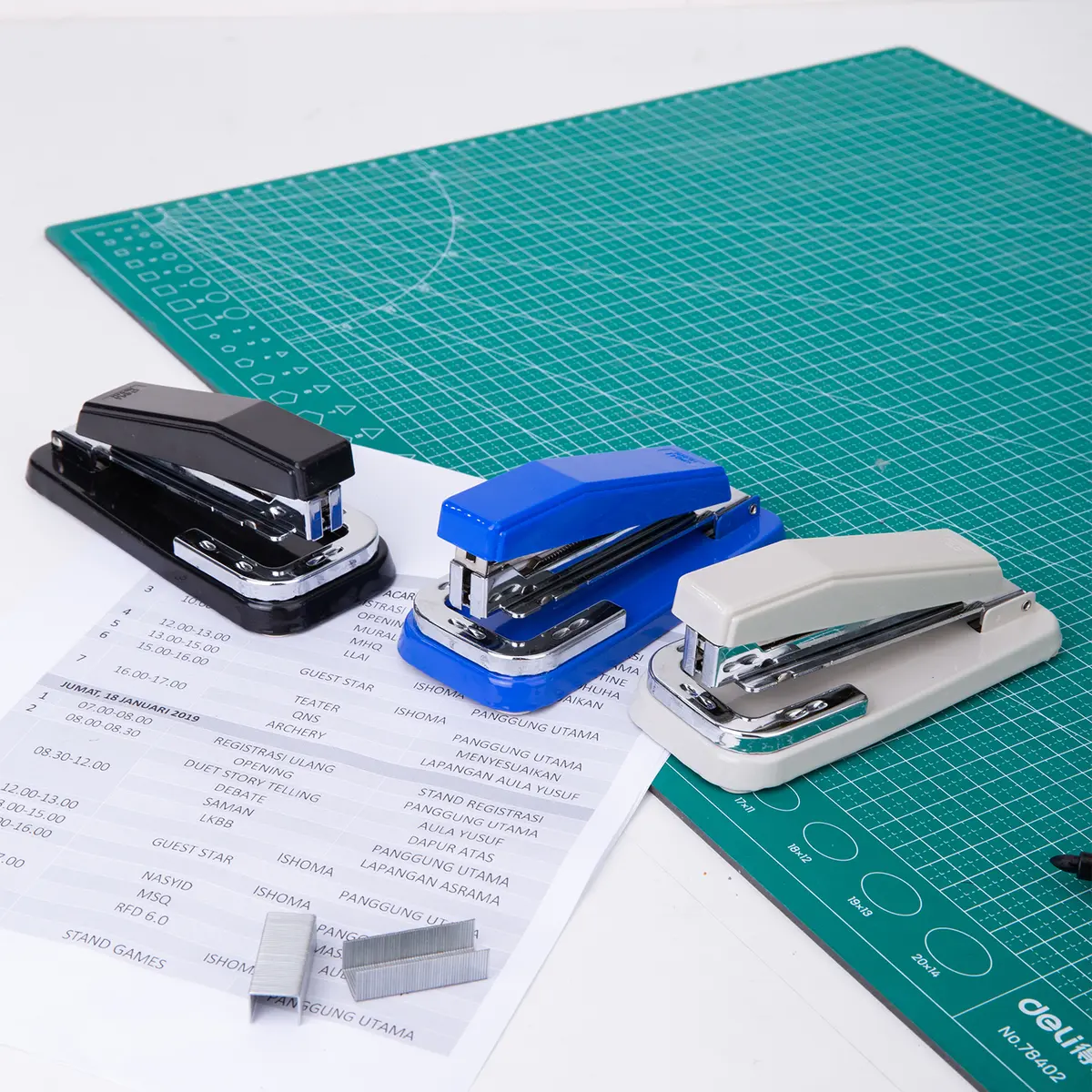 Uses a stapler with No.24/6 or 26/6 size staples/pins. Ergonomic design for a comfortable grip. Constructed of a metal cover and SPCC metal structure and base. Available in three colours i.e. light grey, blue and black.