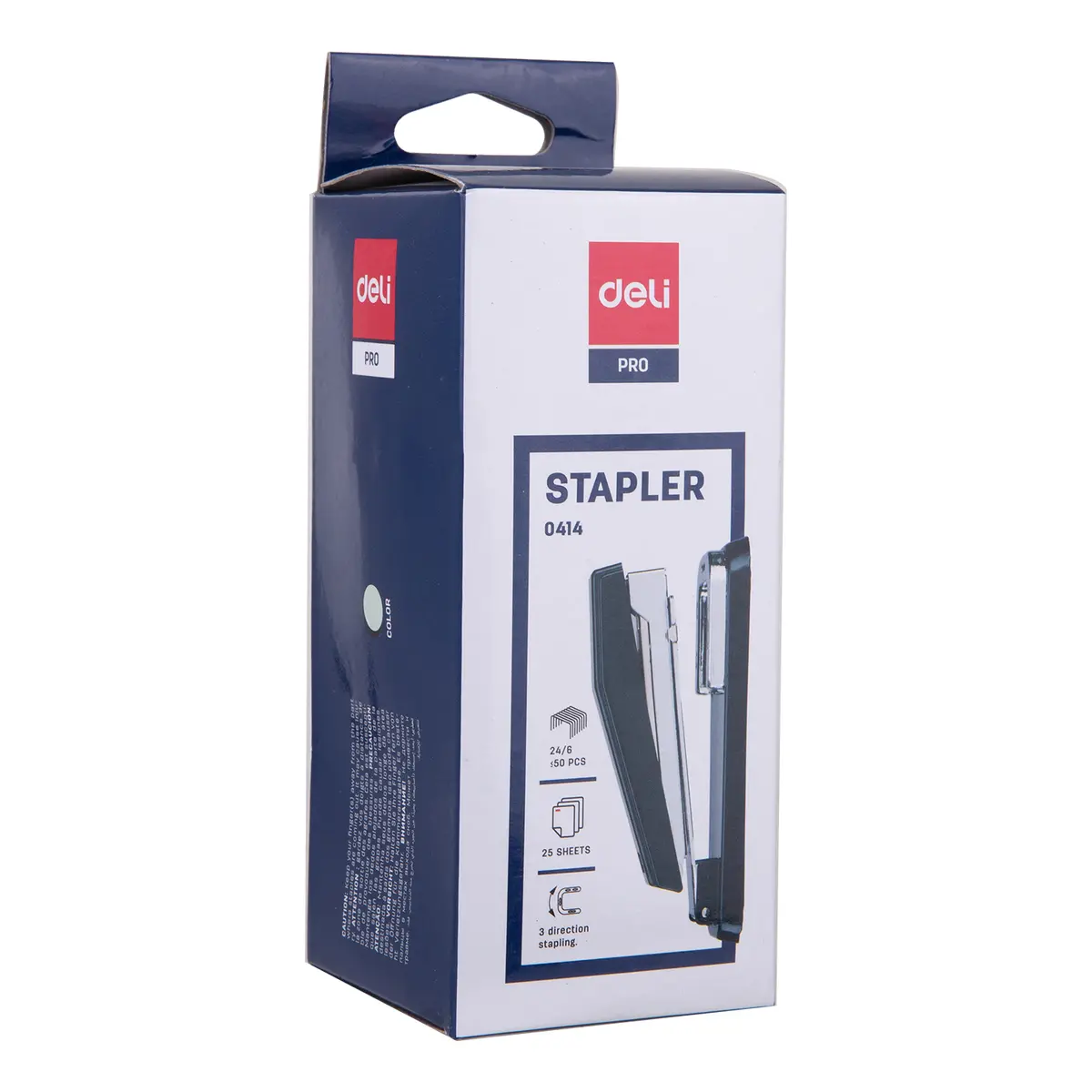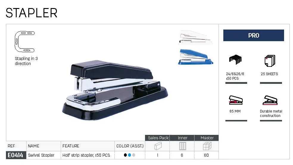 Deli E0414 Swivel Half Strip 24/6 Stapler has a specialized anvil for stapling, tacking and pinning. Rotating position for stapling in 3 directions especially used for booklets binding/stapling. Staple up to 25 sheets of 80 gsm. wide-angle opening. Plastic pull bar. Low staple indicator. Maximum staple filling capacity: Half strip. Ideal for office, school and home use.